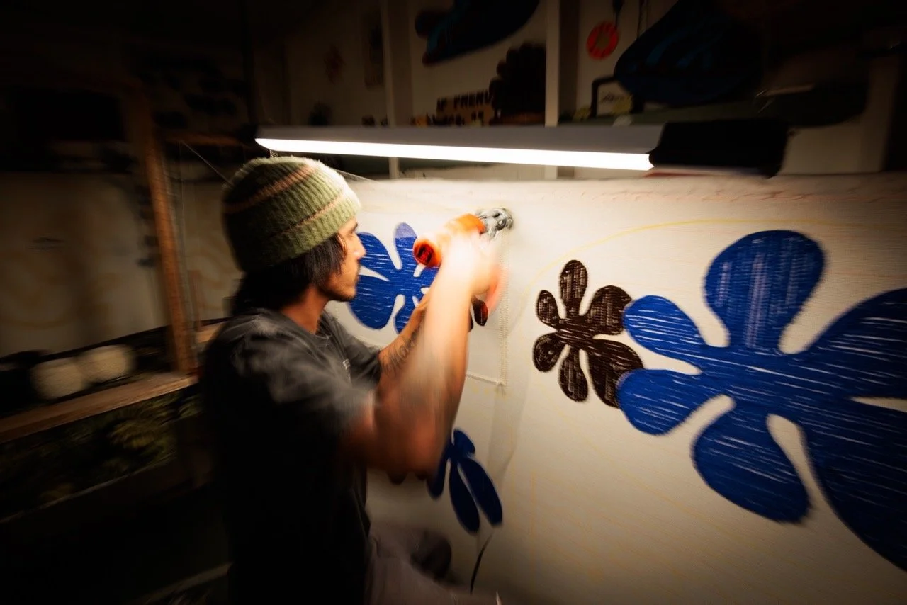 As an artist, Baker doesn’t like feeling limited to what he already knows but continues to learn and make art in a multitude of mediums, creating small- and large-scaled paintings, rugs, and prints, among other things. He not only takes inspiration from his Japanese upbringing, but also the surf community in which he grew up in on Kauai. Baker has collaborated with brands and organizations such as O’hanalei Gallery, RVCA, Honolulu Museum of Art, Greenroom, Amsterdam Wetsuits, Trilogy Coffee, California General Store, Litmus Indigo Japan, Mollusk, Peaceman Gallery, YMCA, Wave Rider Nursery, and more.